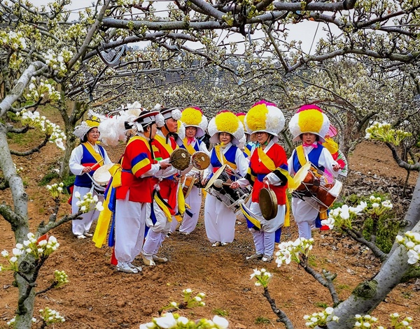 NSP통신-제24회 나주배꽃·유채꽃 전국사진촬영대회 금상작 이화꽃과 농악. (사진 = 나주시)