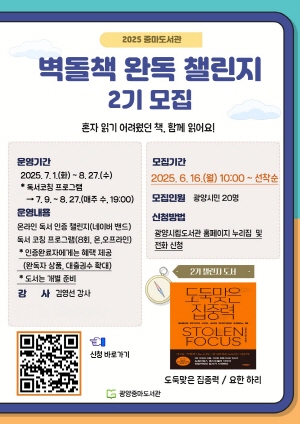 (전남=NSP통신) 김성철 기자 = 광양중마도서관은 시민들의 깊이 있는 독서 습관 형성을 위해 오는 7월부터 ‘벽돌책 완독 챌린지’ 2기를 운영한다고 밝혔다.