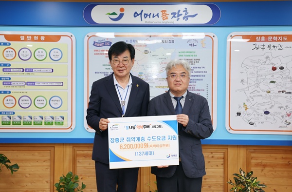 장흥군 관계자는 “지난해에 이어 올해도 협력해주시는 한국수자원공사 장흥지사 장성원 지사장님을 비롯한 직원분들께 다시 한 번 감사드린다”며 “이번 사업을 통해 물복지 지원을 받지 못하는 복지사각지대 대상자 뿐만아니라 다양한 분야에서 복지 혜택을 받지 못하는 가구를 발굴해 지원하도록 노력하겠다”고 밝혔다.