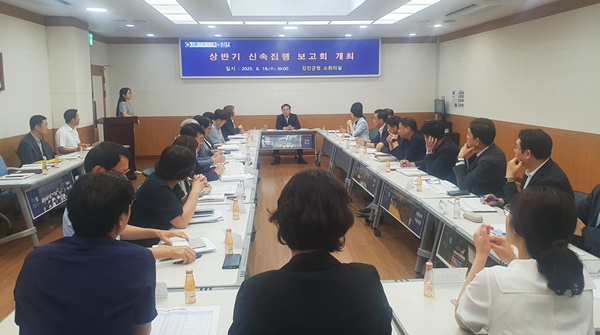 (전남=NSP통신) 김용재 기자 = 강진군이 지난 18일 군청 소회의실에서 ‘2025년 상반기 신속집행 추진상황 보고회’를 개최해 상반기 시설비 사업의 집행 실적을 점검하며 실효성 있는 집행 방안을 모색했다.