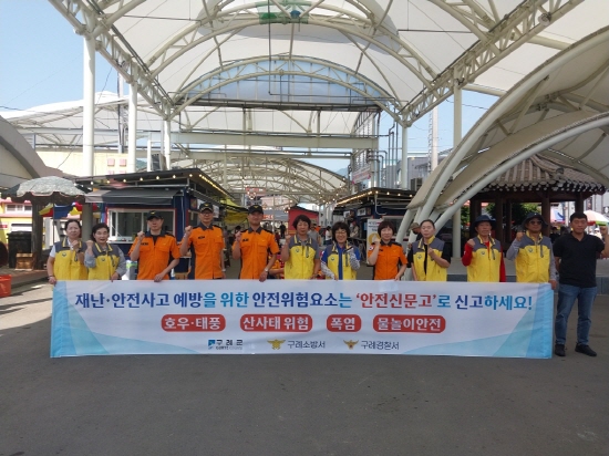 (전남=NSP통신) 김성철 기자 = 구례군은 지난 18일 구례5일시장 일원에서 구례군청, 구례소방서, 안전보안관 등 2개 기관 18명이 참여해 여름철 재난 안전사고 예방을 위한 안전위험요소 집중신고기간 홍보 캠페인을 실시했다고 밝혔다.