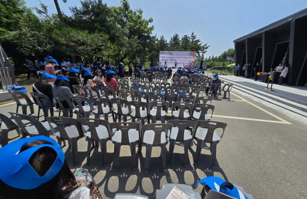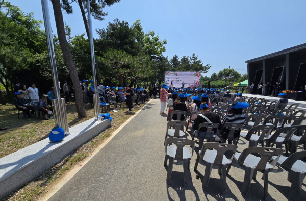 이날 1시간 20여분간 진행된 행사에 참석한 유족들은 70세 이상의 연로한 어르신들로 뙤약볕에서 종이 모자 한 장으로 버티다 근처 나무 그늘로 이동하기도 했다.