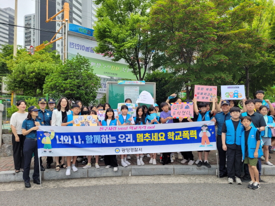 (전남=NSP통신) 김성철 기자 = 광양경찰서(서장 송기주)는 지난 24일 오전 8시에 신학기를 맞아 중진초교 앞에서 학교폭력·청소년범죄 예방을 위한 학생 참여 합동 캠페인을 실시했다.