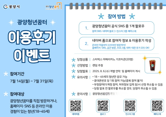 응모자 중 무작위 추첨으로 총 20명을 선정하며 당첨자에게는 5000원 상당의 커피 기프티콘이 제공된다. 당첨자 명단은 오는 8월 6일 광양청년꿈터 누리집에 게시되며 개별 연락을 통해서도 안내할 예정이다. 이벤트 관련 내용은 광양청년꿈터 누리집과 공식 SNS 계정을 통해 확인할 수 있다.