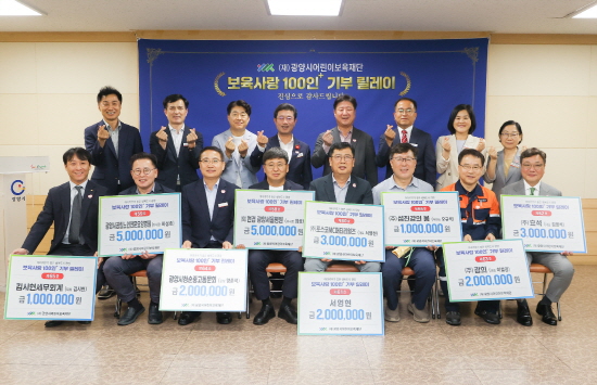 (전남=NSP통신) 김성철 기자 = 광양시어린이보육재단(이사장 이광용)은 지난 17일 광양시청 만남실에서 ‘보육사랑 100인+기부 릴레이’ 후원금 기탁식을 개최했다. 행사에는 정인화 광양시장, 이광용 이사장, 기탁자 등 20여 명이 참석했다.