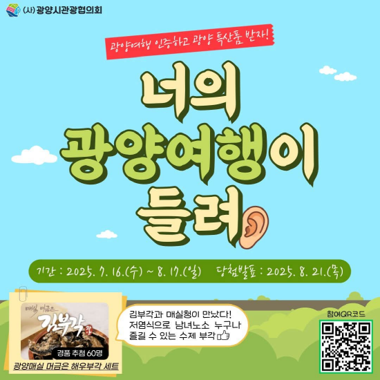 당첨자는 오는 8월 21일 광양시관광협의회 홈페이지와 공식 인스타그램을 통해 발표되며 경품은 발표일로부터 7일 이내에 개별 발송될 예정이다.