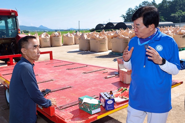 김성 군수는 지난 23일 관내 우리 밀 수매 현장을 방문해 밀 수매농가를 격려하고 애로 사항을 청취했다.