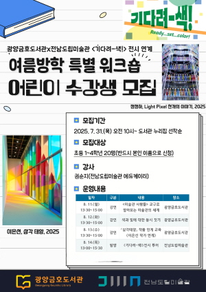 (전남=NSP통신) 김성철 기자 = 광양금호도서관은 전남도립미술관과 체결한 지역 문화예술 발전을 위한 상호 업무협약을 토대로 오는 8월 11일~14일까지 4일간 ‘여름방학 어린이 특별 워크숍’을 운영한다고 밝혔다.