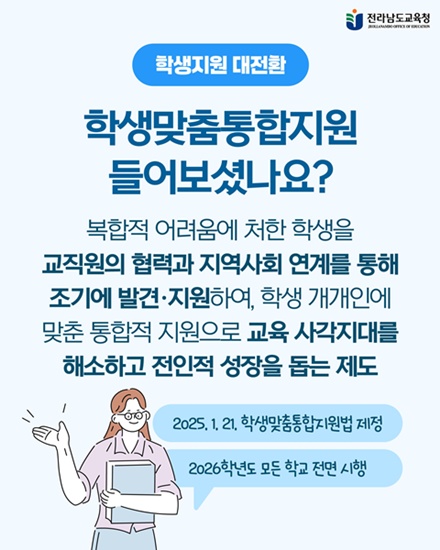 한편 전남교육청은 학생맞춤 통합지원을 통해 위기 상황에 놓인 학생들을 조기에 발굴하고 학생 중심의 맞춤형 통합지원 서비스를 제공하는 등 지속가능한 학생 지원 체계를 가동하고 있다.