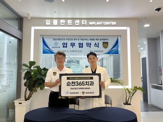 (전남=NSP통신) 김성철 기자 = 전남드래곤즈(대표이사 김규홍)가 순천365치과(대표원장 김영선)와 손잡고 구단의 의료지원 체계 강화와 지역 상생에 나섰다.