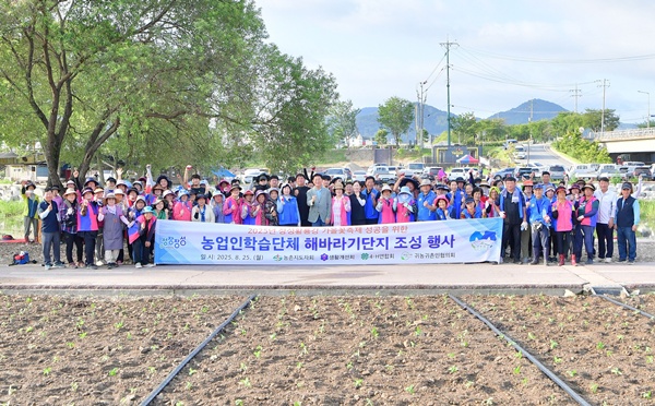 한국농촌지도자장성군연합회·한국생활개선장성군연합회·장성군4-H(에이치)연합회·귀농귀촌인협의회 회원 200여 명이 장안교~연꽃단지 일원에 모여 해바라기단지를 조성했다.