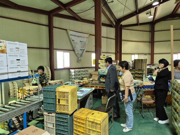 (전남=NSP통신) 김용재 기자 = 조상래 곡성군수가 지난 달 29일 목사동면에 소재 곡성군배영농조합법인(대표 정복기)을 방문해 배 수출을 위해 선별 작업에 참여 중인 농가와 관계자들을 격려했다.