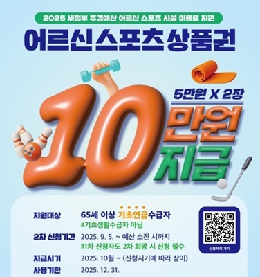 65세 이상 기초연금 수령 주민에게 1인당 5만 원 상당의 스포츠 상품권(모바일 상품권)을 2장씩 총 10만 원을 지급한다.