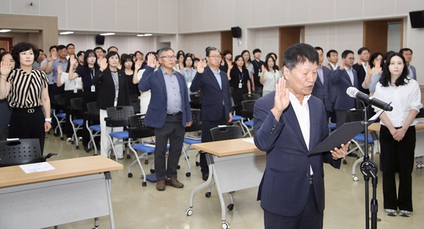 서약식에는 교육감을 비롯해 국장급 간부와 본청 전 직원이 참여했으며, 문태홍 정책국장이 대표로 서약서를 낭독했다.