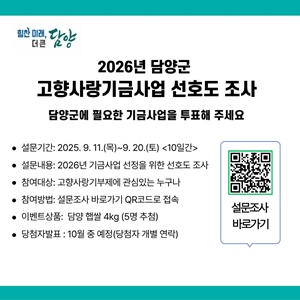 (전남=NSP통신) 김용재 기자 = 담양군(군수 정철원)은 2026년 고향사랑기금사업 선정에 기부자와 군민의 의견을 반영하기 위해 11일부터 20일까지 10일간 ‘담양군 고향사랑기금사업 선호도 조사’를 진행한다.