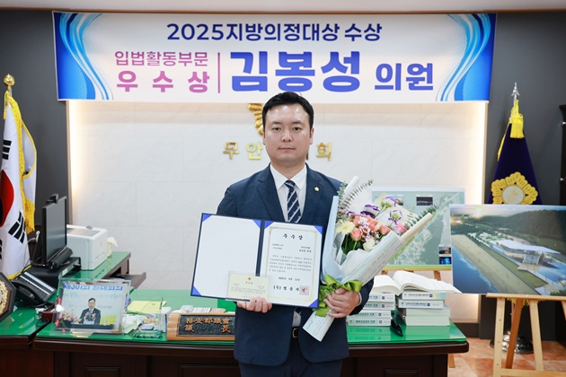 (전남=NSP통신) 오환주 기자 = 무안군의회 김봉성 의원(행정문화복지위원장, 더불어민주당)이 법률저널이 주최한 ‘2025 지방의정대상’에서 입법활동 부문 우수상을 수상했다고 18일 밝혔다.