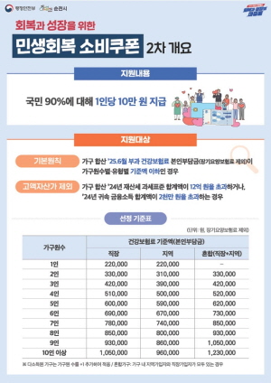 지급 기준은 2025년 6월 건강보험료를 기준으로 한 가구 합산 소득 하위 90%다. 다만 재산세 과표 12억 원 이상 또는 금융소득 2000만 원 초과자는 제외된다. 사용 기한은 11월 30일까지로 미사용 잔액은 자동 소멸된다.
