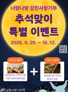 (전남=NSP통신) 김용재 기자 = 강진군이 추석 명절을 맞아 너랑나랑 강진사랑기부 이벤트를 진행한다.