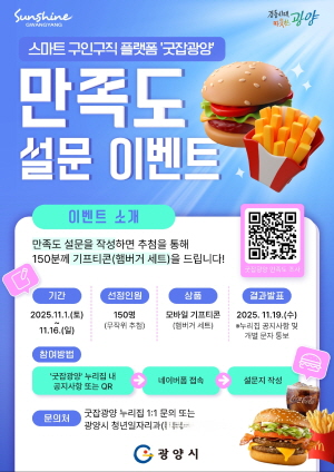 설문은 약 3~5분 내로 완료할 수 있으며 참여자 중 150명을 무작위로 추첨해 햄버거 세트 모바일 기프티콘을 증정한다. 당첨 결과는 오는 11월 19일 굿잡광양 누리집 공지사항을 통해 발표되며 당첨자에게는 개별 문자로 안내할 예정이다. 이벤트 관련 내용는 누리집 내 1:1 문의 게시판 또는 광양시 청년일자리과 산업인력팀으로 하면 된다.