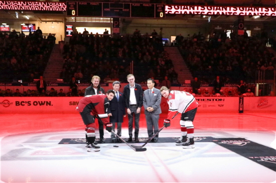 ‘퍽 드랍(Puck Drop)’은 캐나다 아이스하키 경기에서 가장 상징적인 개막 의식으로, 경기의 시작을 알리는 동시에 귀빈에게만 주어지는 명예로운 세리머니다. 양 도시 시장이 함께 퍽 드랍을 진행한 이번 장면은 국제우호도시로서의 첫 협력과 우정을 공식적으로 알리는 뜻깊은 순간으로 경기장을 가득 메운 관중의 박수와 환호 속에 진행됐다.