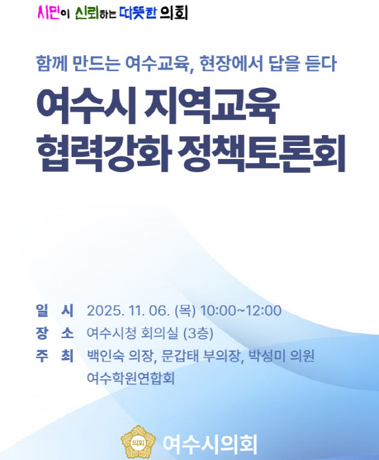 (전남=NSP통신) 서순곤 기자 = 여수시의회는 오는 6일 오전 10시, 여수시청 3층 회의실에서 “함께 만드는 여수교육, 현장에서 답을 듣다”를 주제로 ‘여수시 지역교육 협력강화 정책토론회’를 개최한다.