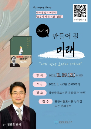 (전남=NSP통신) 김성철 기자 = 광양시는 오는 11월 29일 오후 2시 광양중앙도서관 문화공간 ‘하루’에서 천종호 판사를 초청해 인문학 강연 ‘모두의 서재’ 네 번째 시간을 연다고 밝혔다.