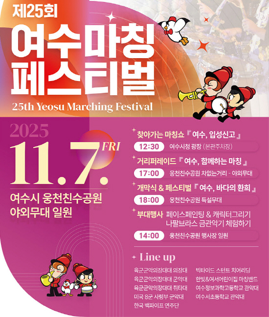 (전남=NSP통신) 서순곤 기자 = 여수시는 오는 11월 7일 오후 6시 웅천친수공원에서 대한민국 3대 관악제 중 하나인 ‘여수마칭페스티벌’을 개최한다.