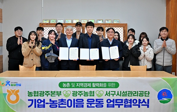 (광주=NSP통신) 김용재 기자 = 농협광주본부(본부장 이현호)는 지난 11일 광주 북구 무등산 평촌마을에서 광주농협(조합장 김순택), 서구시설관리공단(이사장 직무대행 정창욱)과 함께 ‘기업-농촌이음 운동’ 업무협약을 체결했다.