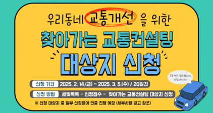 교통 개선을 희망하는 시민은 3월 5일까지 신청하면 된다. 시는 3월 중 신청지를 검토한 후 찾아가는 컨설팅 대상지를 선정하고 4월부터 ‘찾아가는 컨설팅’을 진행할 계획이다.