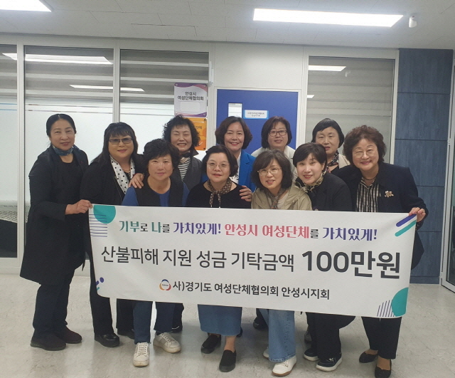 (경기=NSP통신) 김병관 기자 = 경기 안성시 여성단체협의회(회장 김미경)은 지난 8일 최근 전국적으로 발생한 산불 피해 지역 주민들을 돕기 위해 100만원의 성금을 사랑의 열매에 기탁했다.
