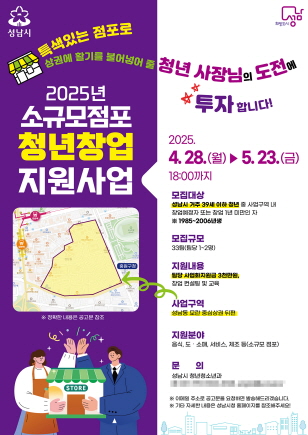 (경기=NSP통신) 김병관 기자 = 경기 성남시(시장 신상진)는 소규모 점포를 창업하는 청년 33개 팀(팀당 1~2명)에 사업화 자금 3000만원과 컨설팅을 지원하는 사업을 편다.