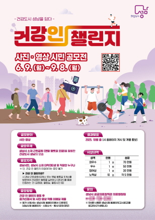 (경기=NSP통신) 김병관 기자 = 경기 성남시(시장 신상진)는 9일부터 오는 9월 8일까지 ‘건강도시 성남을 담다’를 주제로 ‘건강 인 챌린지 사진·영상 시민 공모전’을 개최한다.