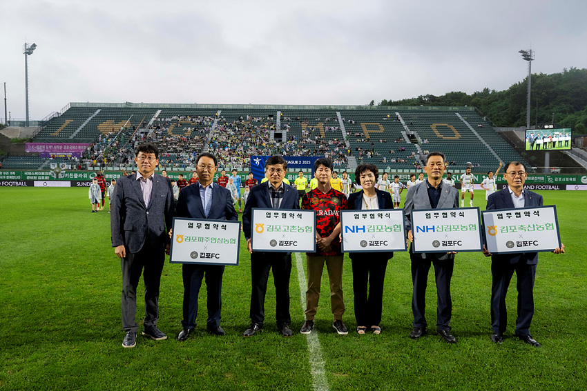 경기 시작 직전에는 관내 5개 농협 조합장이 참여하는 공식 업무 협약식이 그라운드에서 진행됐다. 이번 협약을 통해 김포FC와 농협은 지역 사회 발전과 농업 홍보를 위한 다양한 활동을 전개할 예정이다.