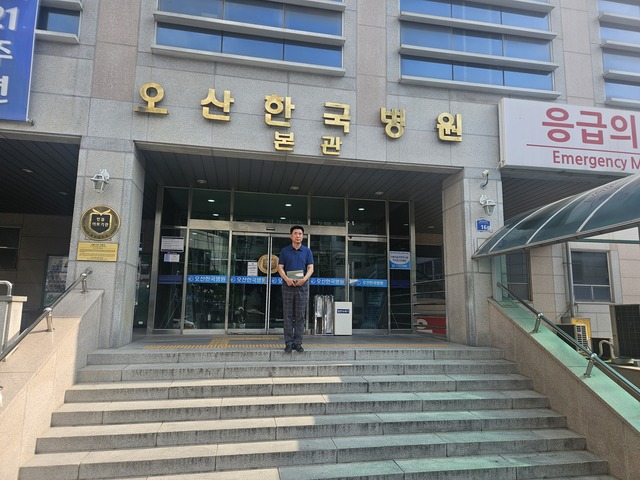 24일 성길용 오산시의회 부의장이 사고 현장 목격 공무원을 병문안 하기 위해 병원을 방문한 모습. (사진 = 성길용의원)