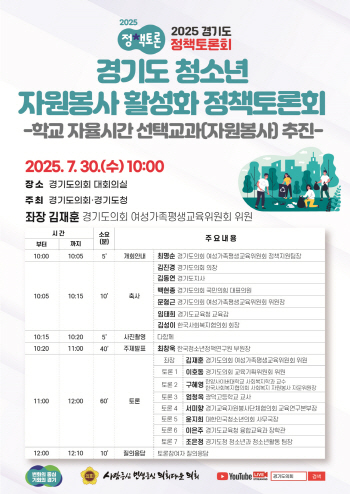 이어지는 토론에서는 ▲이호동 경기도의회 교육기획위원회 위원 ▲구혜영 한양사이버대 사회복지학과 교수 ▲엄청옥 광덕고등학교 교사 ▲서미향 경기교육자원봉사센터협의회 교육연구분과장 ▲윤지희 대한민국청소년의회 사무국장 ▲이은주 경기도교육청 융합교육과 장학관 ▲조은정 경기도청 청소년과 청소년활동팀장 등이 토론자로 참여해 자원봉사 교과 도입의 필요성과 실행방안에 대해 다양한 시각에서 토론을 펼칠 예정이다.