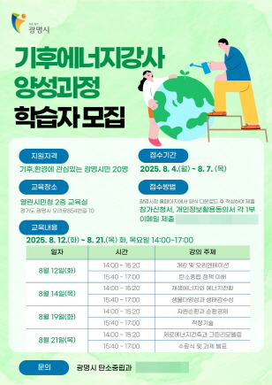 (경기=NSP통신) 서국현 기자 = 경기 광명시(시장 박승원)는 오는 7일까지 기후위기 대응과 탄소중립 실천 확산을 위해 ‘기후에너지강사 양성과정’ 참여자를 모집한다.