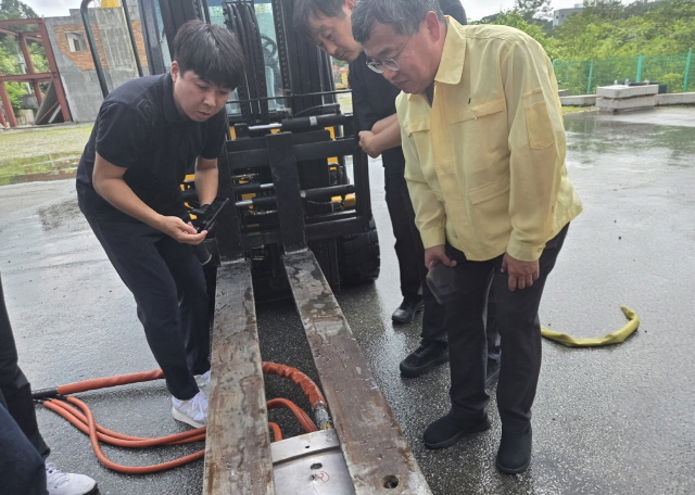 장대석 경기도의원이 전기차 화재 대응 위한 특수장비의 성능을 검증하고 있다. (사진 = 경기도의회)