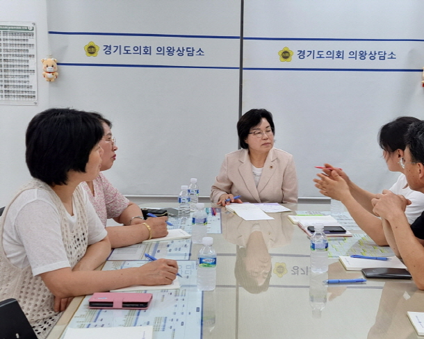 NSP통신-김옥순 경기도의회 도시환경위원회 의원이 7일 의왕상담소에서 조리사 및 조리실무사들과 급식실 현대화 사업 추진 관련 간담회를 하고 있다. (사진 = 경기도의회)