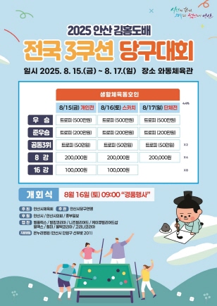(경기=NSP통신) 김병관 기자 = 경기 안산시(시장 이민근)는 오는 15일부터 17일까지 3일간 와동체육관에서 ‘2025 안산 김홍도배 전국 3쿠션 당구대회’를 개최한다.