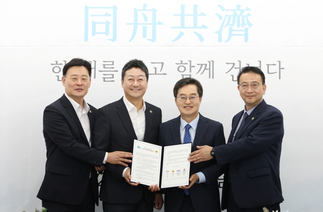 NSP통신-13일 오전 도담소에서 열린 2025 여야정협치위원회 협약식에서 김동연 경기도지사, 김진경 경기도의회 의장, 최종현 경기도의회 더불어민주당 대표의원, 백현종 경기도의회 국민의힘 대표의원이 협약서에 서명하고 기념촬영을 하고 있다. (사진 = 경기도)