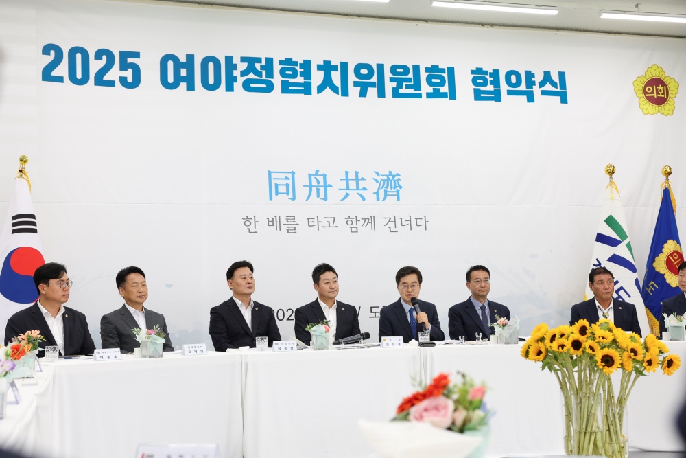 김동연 경기도지사와 김진경 경기도의회 의장, 최종현 도의회 민주당 대표, 백현종 국민의힘 대표는 13일 도담소(옛 경기도지사 공관)에서 ‘2025년 여야정협치위원회 협약식’을 열고 이런 내용을 담은 여야정 협치위원회 공동협약서에 서명했다.