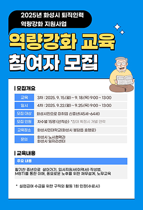이번 교육은 ‘2025년 화성시 퇴직인력 역량강화 지원사업 : 신중년 점프업 프로젝트’의 일환으로 마련됐다.