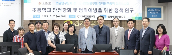 ‘초등학교 안전강화 및 범죄예방을 위한 정책제언-늘봄학교를 중심으로’ 주제로 진행한 정책연구용역 최종보고회 참석자들이 기념촬영을 하고 있다. (사진 = 경기도의회)