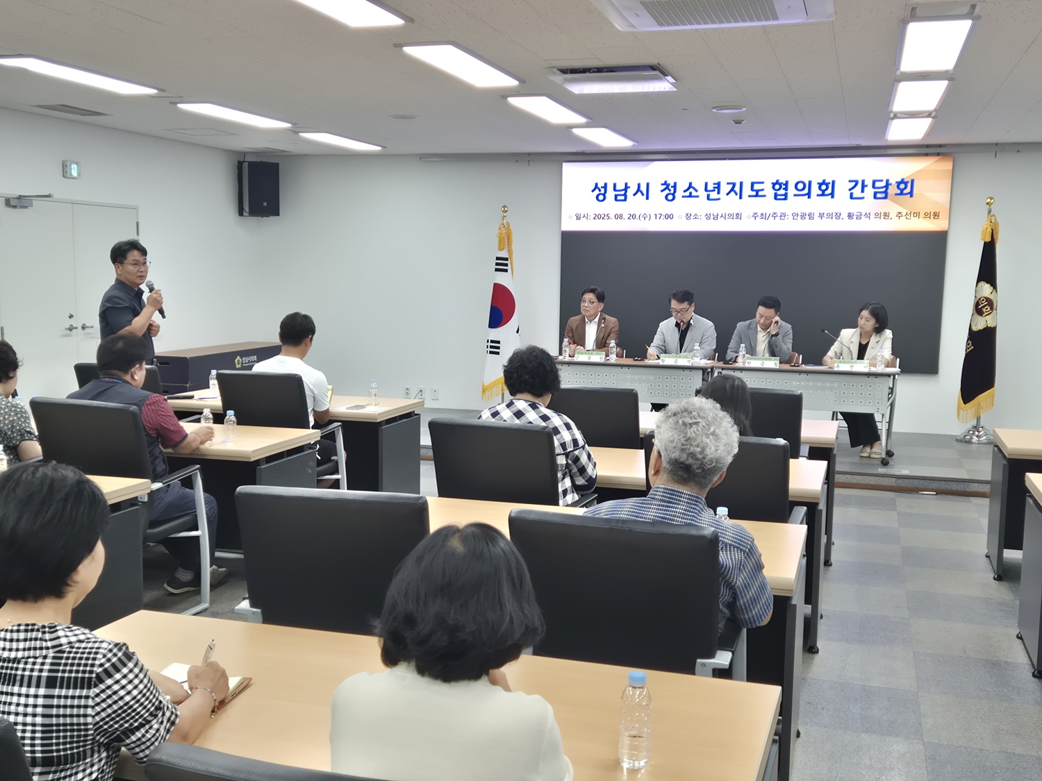(경기=NSP통신) 김병관 기자 = 경기 성남시의회 안광림 부의장(성남동, 하대원동, 도촌동), 황금석 의원(상대원1동, 상대원2동, 상대원3동), 추선미 의원(중앙동, 금광1·2동, 은행1·2동)은 공동주최·주관으로 ‘성남시 청소년지도협의회 간담회’를 20일 시의회 4층 세미나실에서 개최했다.