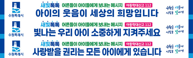 (경기=NSP통신) 조현철 기자 = 경기 수원시(시장 이재준)가 아동학대 예방 분위기를 조성하기 위해 시민이 작성한 메시지를 담은 현수막을 8월 말부터 9월까지 시내 주요 지점에 게시한다.