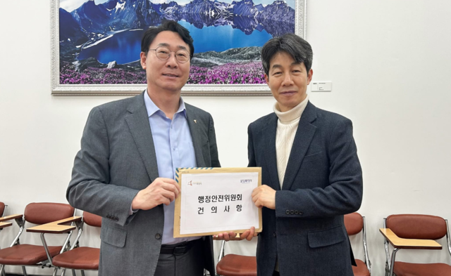 NSP통신-정명근 화성시장(왼쪽)이 국회 행정안전위원회에 일반구 신설 건의안을 제출하고 있다. (사진 = 화성시)