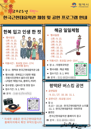 평택시 관계자는 “한국근현대음악관이 시민과 함께 소통하는 열린 문화공간으로 자리매김하기를 바란다”라며 “앞으로도 다양한 프로그램을 통해 시민의 문화 향유 기회를 지속적으로 확대해 가겠다”라고 말했다.