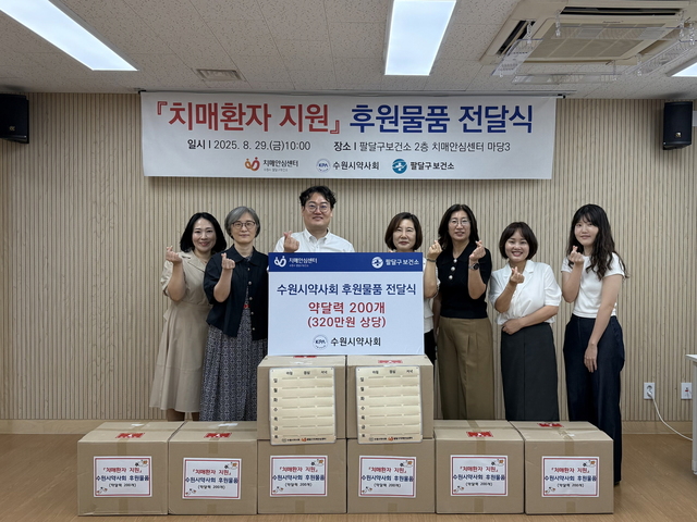 팔달구보건소 2층 치매안심센터에서 열린 후원물품 전달식에는 최향란 팔달구보건소장, 김호진 수원시약사회 회장 등이 참석했다.