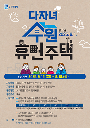 (경기=NSP통신) 조현철 기자 = 경기 수원시(시장 이재준)가 9월 15일부터 18일까지 ‘다자녀 수원휴먼주택’ 입주자’를 모집한다.