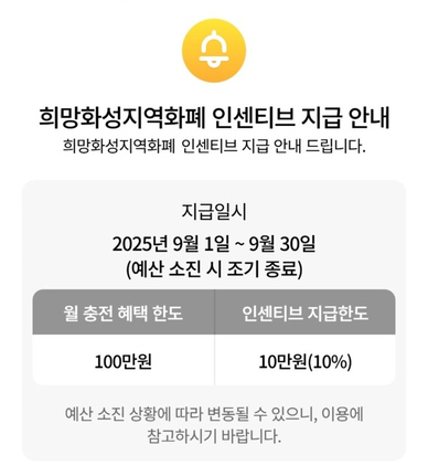 희망화성지역화폐는 오는 11월 30일까지 한시적으로 기존 가맹점뿐만 아니라 연매출 30억원 이하 비가맹점(민생회복 소비쿠폰 사용처)에서도 사용할 수 있다.
